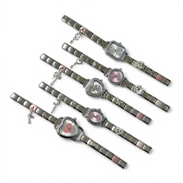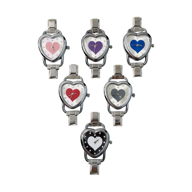 ※こちらはイタリアンチャームは付属せず、時計本体のみの販売です。 愛らしいハート型デザインの時計です。 可愛い見た目で、普段使いにもピッタリ◎ お手持ちのチャームやパーツと組み合わせて、 自分だけのスタイルをお楽しみいただけます♡ こちらの時計は、左手につけるとデザインが内側になる仕様です。右手につける場合は、デザインが外側になります。向きが気になる方やご希望がある方は、お気軽にDMください♡ ご購入前に、必ずご自身の腕のサイズを測ってからお選びください。イタリアンチャームは、腕のサイズに合わせて粒数を調整してお作りいただきます。 一般的な女性の平均的な手首サイズ(約15〜16cm)の場合、イタリアンチャームは 約17〜18粒 が目安でございます。 【粒数の目安】 ・手首 約14〜15cm:16〜17粒 ・手首 約15〜16cm:17〜18粒(平均) ・手首 約16〜17cm:18〜19粒 ※時計パーツ1点で約6粒分となります。時計を入れる場合は、その分を含めた無地パーツのご購入をお願いいたします。 ※無地パーツ・組み立てスプーンは付属しておりません。必要な場合は、商品オプションより別途ご購入ください。 ⚪︎サイズ選びや粒数が分からない場合は、kum(@kum_shibuya)のInstagramにてお気軽にご相談ください。 ▽ご注意事項 ※強い力を加えると破損の原因となります。 ※水濡れ・汗・摩擦により、変色する場合がございます。 ※画像は実物に近い色味で撮影しておりますが、撮影環境や光の加減により、実際の商品と多少異なって見える場合がございます。 ※電池は消耗品です。動かなくなった場合は、電池交換にてご対応ください。